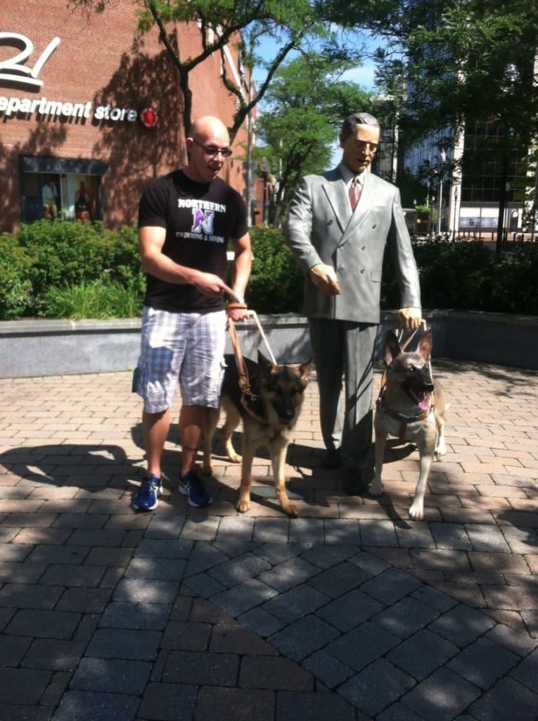 (Picture description: Tony and his guide dog, a German Shepherd, stand next to a statue of a man with a German Sheperd guide dog.)